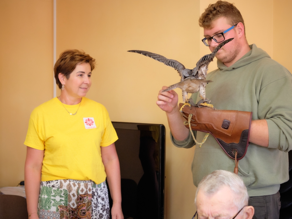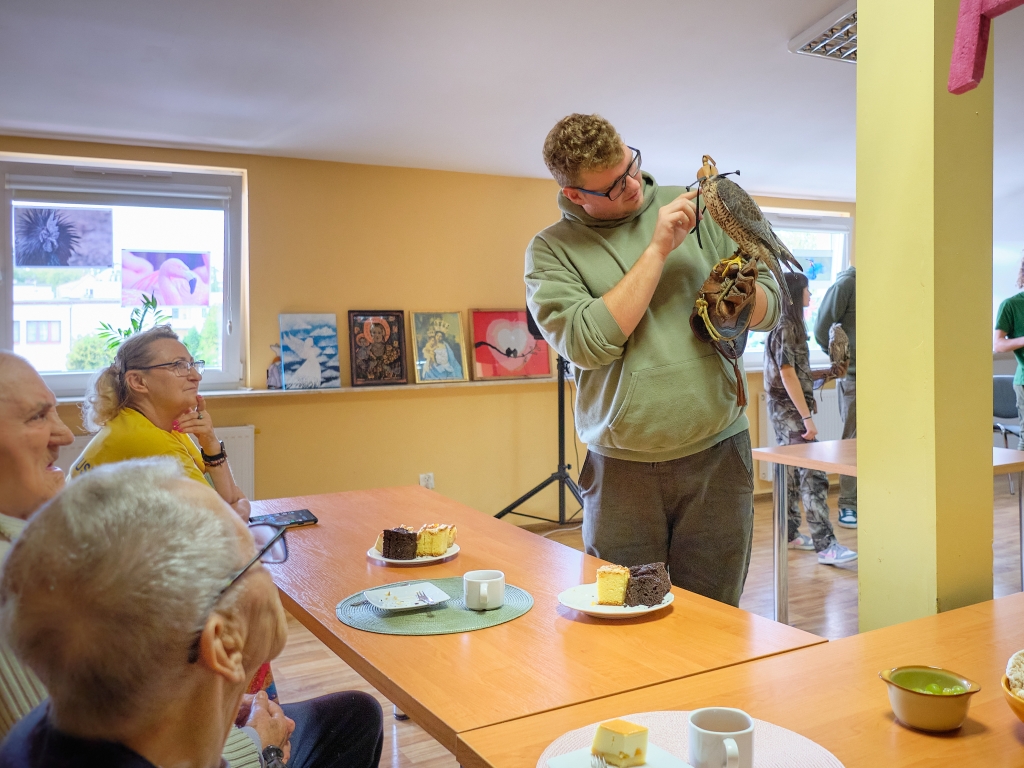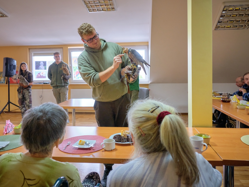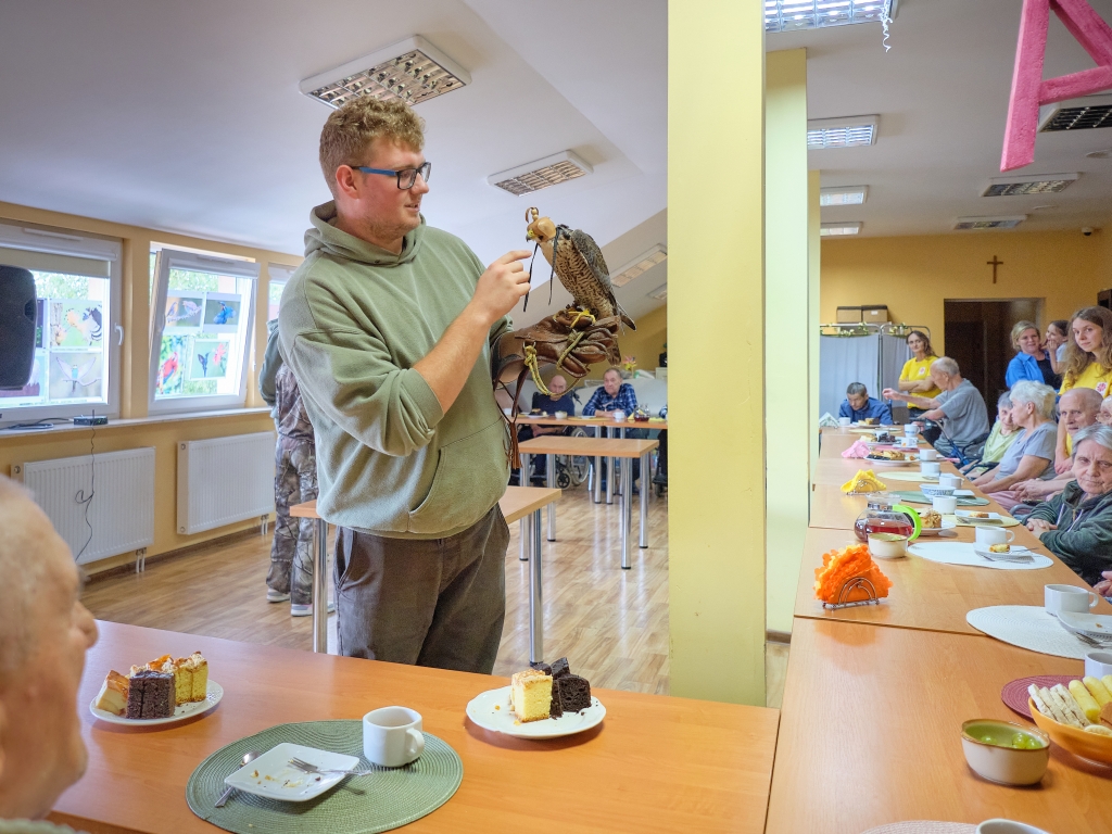 11 września 2025 r. po raz drugi w ramach cyklu „Pod niebem jest pięknie tu” spróbowaliśmy wspólnie z pacjentami i wolontariuszami Hospicjum im. św. Matki Teresy z Kalkuty w Kielcach wznieść się ponad smutek, niepokój, samotność i cierpienie. Pomagali nam w tym uczniowie i nauczyciele Zespołu Szkół Leśnych im. Edwarda Gesinga z Zagnańska oraz ich skrzydlaci podopieczni. Młodzież w ramach Szkolnego Koła Caritas i Koła Sokolniczego podejmuje opiekę nad drapieżnymi, dzikimi ptakami, które z różnych przyczyn nie mogą żyć na wolności. Dbają o nie, poznają ich zwyczaje i potrzeby, na wakacje zabierają do domów, a w ostatni czwartek z sokołem i dwiema sowami odwiedzili nas w Hospicjum