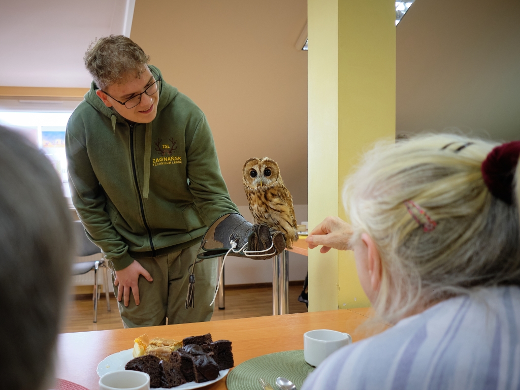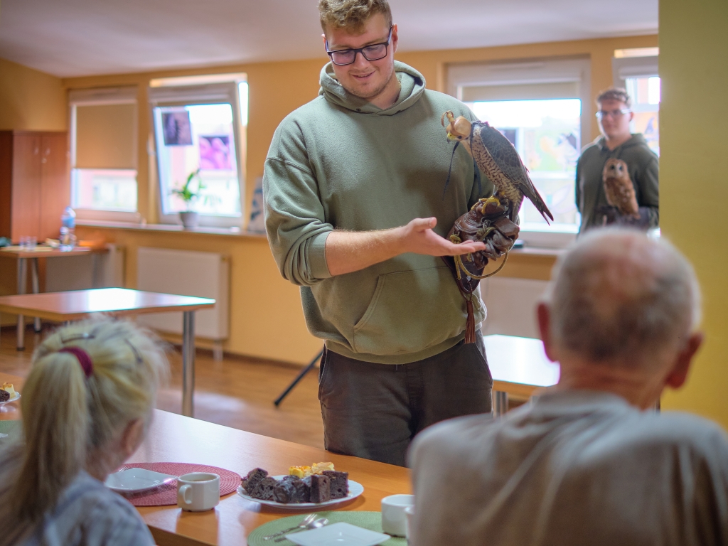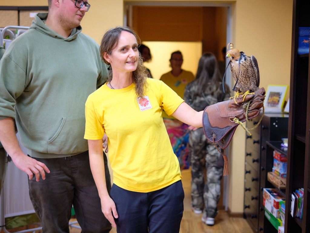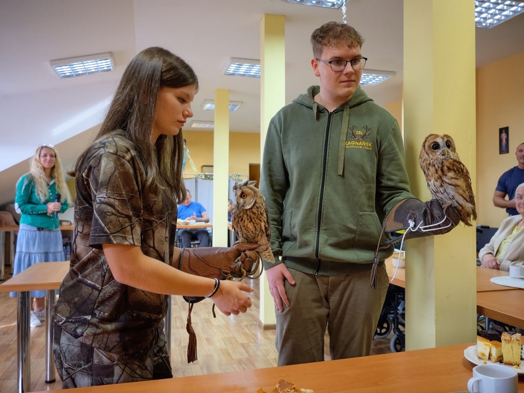 11 września 2025 r. po raz drugi w ramach cyklu „Pod niebem jest pięknie tu” spróbowaliśmy wspólnie z pacjentami i wolontariuszami Hospicjum im. św. Matki Teresy z Kalkuty w Kielcach wznieść się ponad smutek, niepokój, samotność i cierpienie. Pomagali nam w tym uczniowie i nauczyciele Zespołu Szkół Leśnych im. Edwarda Gesinga z Zagnańska oraz ich skrzydlaci podopieczni. Młodzież w ramach Szkolnego Koła Caritas i Koła Sokolniczego podejmuje opiekę nad drapieżnymi, dzikimi ptakami, które z różnych przyczyn nie mogą żyć na wolności. Dbają o nie, poznają ich zwyczaje i potrzeby, na wakacje zabierają do domów, a w ostatni czwartek z sokołem i dwiema sowami odwiedzili nas w Hospicjum