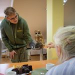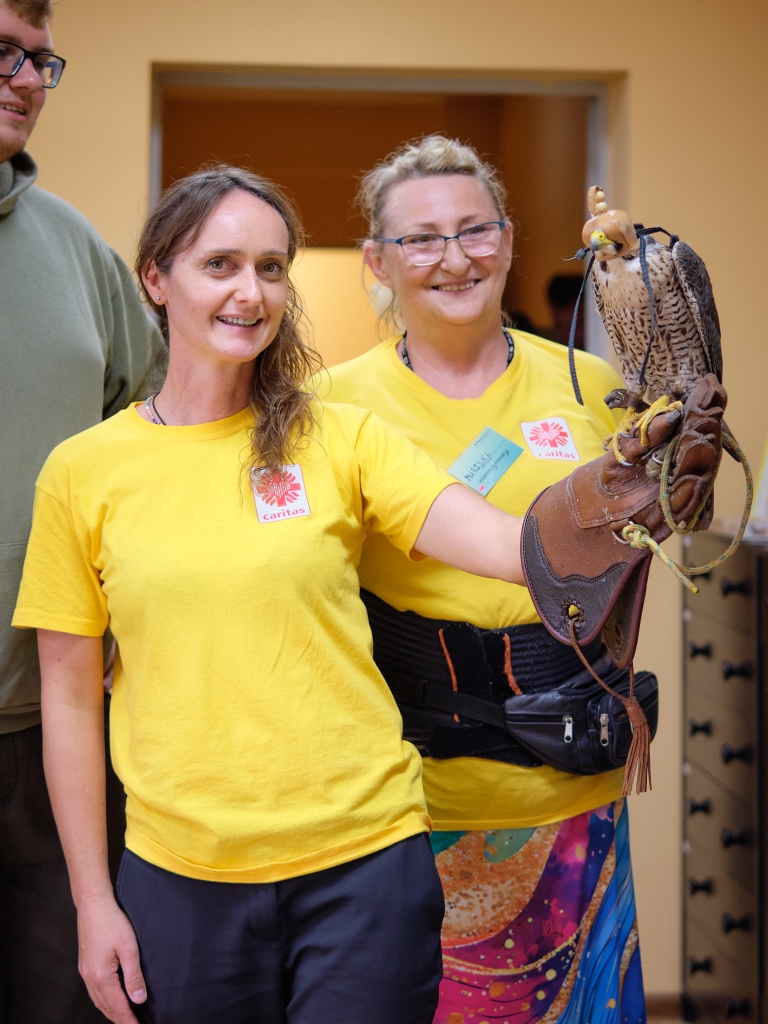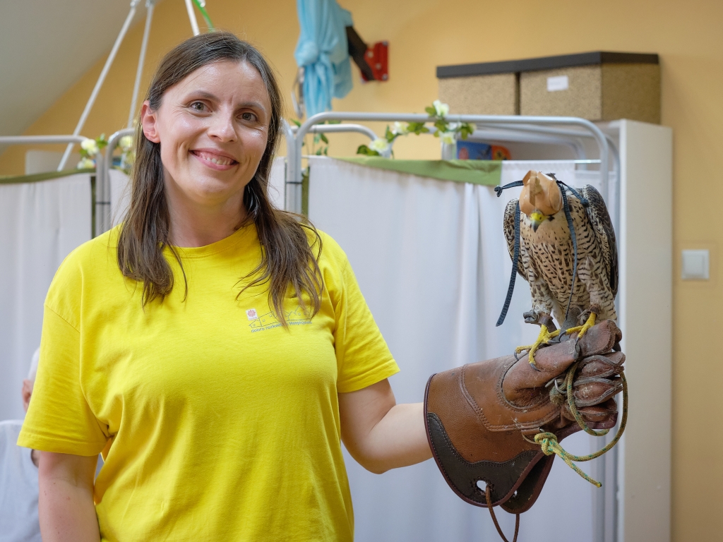Niezwykłym momentem była sesja zdjęciowa. Radek, jeden z opiekunów „skrzydlatych przyjaciół” zdecydował się delikatnie zsunąć skórzaną ochronną rękawicę i wraz z siedzącym na niej sokołem kolejno zakładał je na ręce zainteresowanych pacjentów. Ich przejęcie i zachwyt – absolutnie bezcenne dla organizatorów.