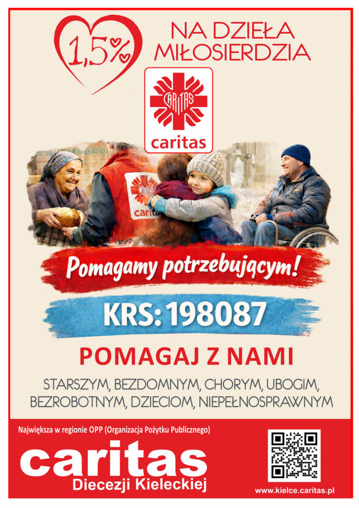 Zachęcamy do przekazania 1,5 % podatku w rozliczeniu rocznym za 2025 r. na dzieła miłosierdzia realizowane przez Caritas Diecezji Kieleckiej. Podejmując rozmaite wyzwania społeczne staramy się skutecznie służyć bliźnim w potrzebie. W naszych strukturach funkcjonują hospicja dla dorosłych i dla dzieci, domy opieki dla starszych, świetlice środowiskowe dla dzieci i młodzieży, schroniska dla osób w kryzysie bezdomności i stołówki charytatywne dla ubogich. Wsparcie otrzymują osoby dotknięte klęskami żywiołowymi, zdarzeniami losowymi oraz doświadczające przemocy domowej. Prowadzimy aktywizację zawodową i społeczną osób niepełnosprawnych, a dla dzieci z rodzin uboższych organizujemy kolonie charytatywne, dożywianie i programy stypendialne.